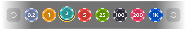 The Chips screen allows you to select the value of chips you will use for betting. Only chip values that can be covered by your current balance are available.