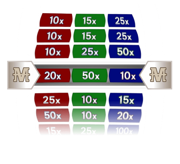La ruleta gigante comienza a girar. Cuando se detiene, los multiplicadores de la línea de premio se suman a la caja de premios total de cada color.